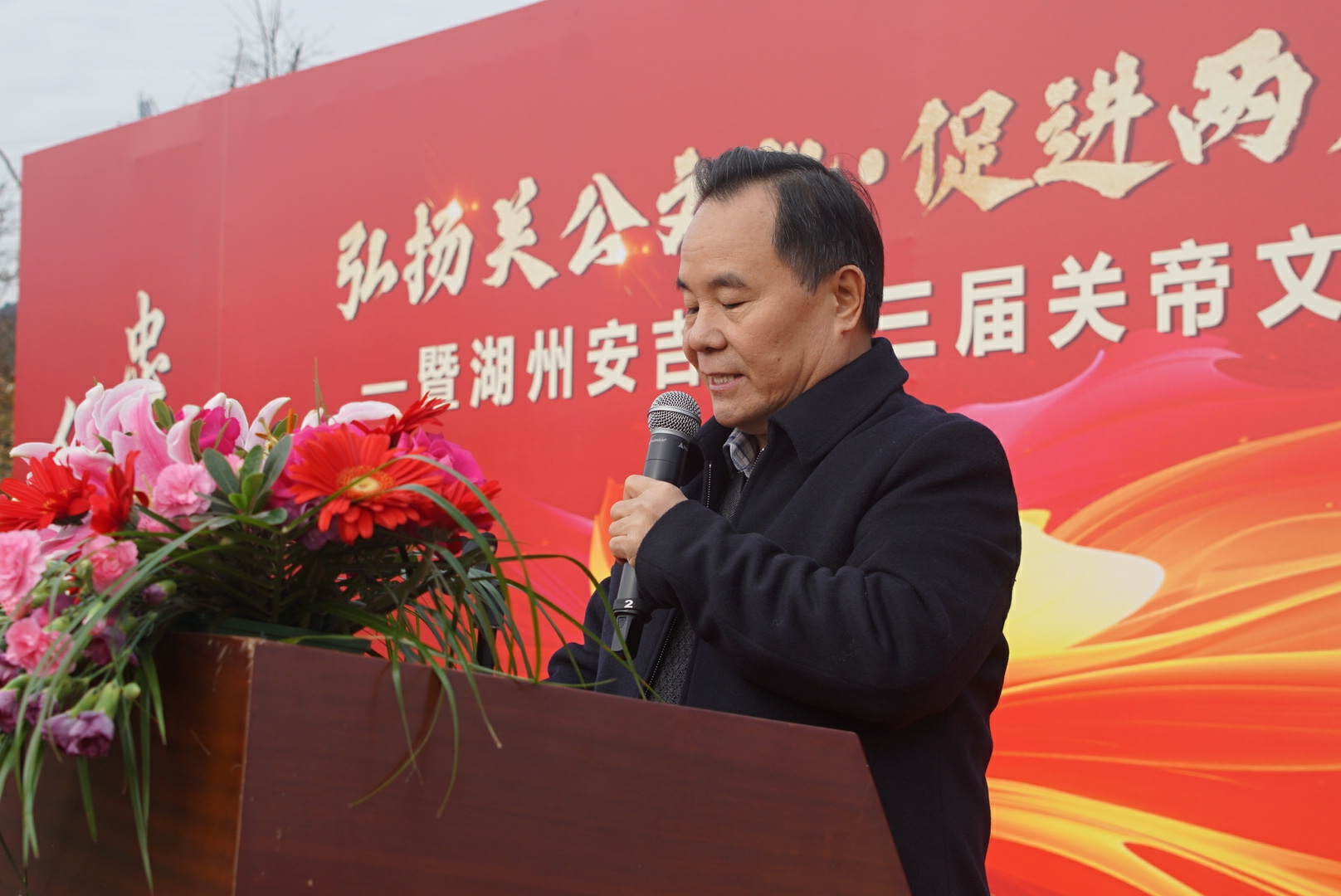 世界关公文化联合发展总会李存有会长在致辞中,代表世界关公总会,向全国各地不远千里赶来参加本次弘扬关公文化促进两岸统一暨湖安市安吉第三届关帝文化节大型活动的关公会各位会长及兄弟姐妹们表示衷心感谢!他说,弘扬关公文化,传承忠义精神!忠党爱国,孝敬父母,忠于事业,忠于家庭,忠义朋友,不断改善当今社会新时代的伦理道德建设新局面,积极响应国家提出的大力弘扬中国优秀传统文化伟大号召,讲好中国故事,传播好中国声音,以文化自信,文化强国,践行新时期的社会主义价值观。