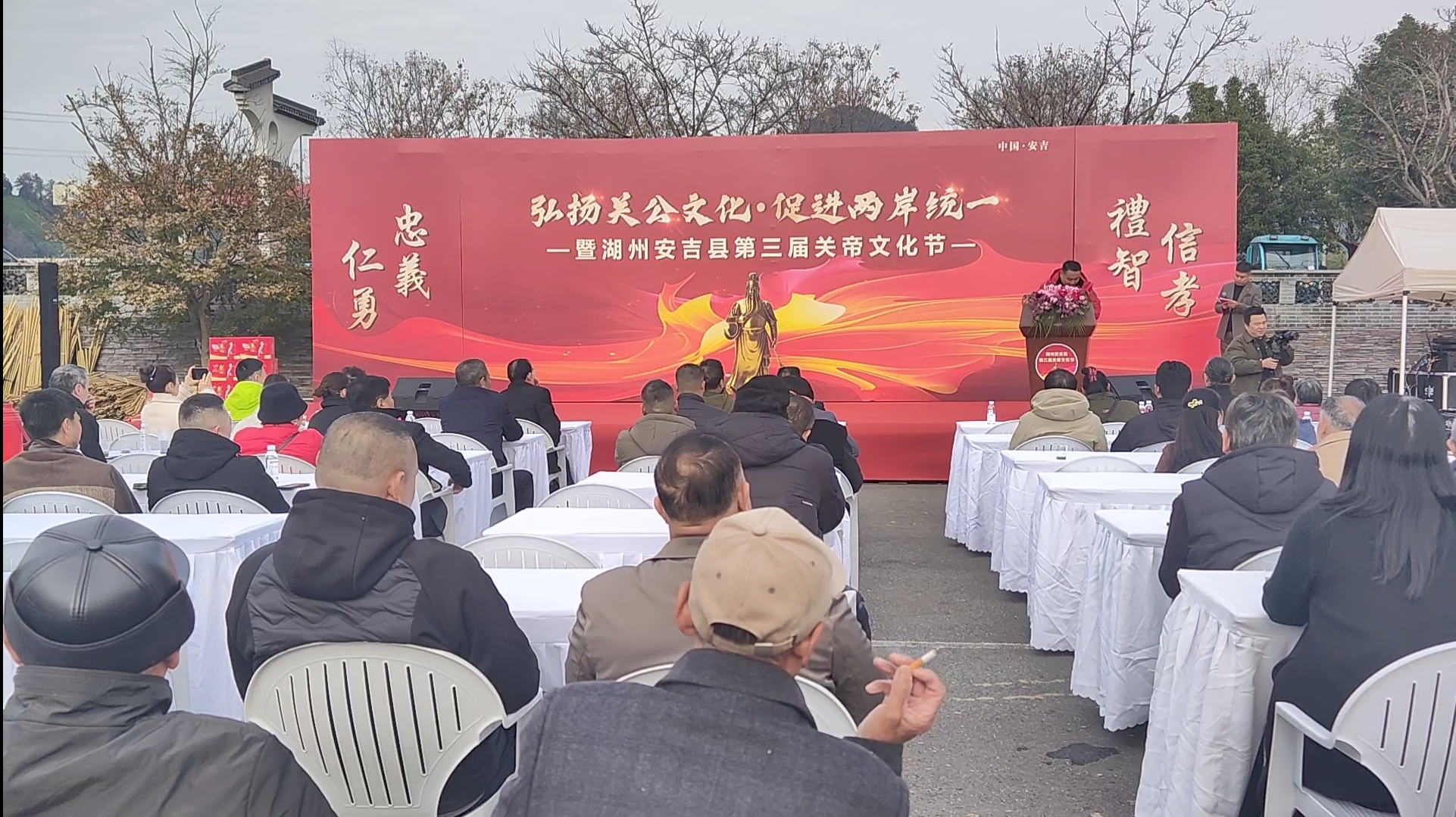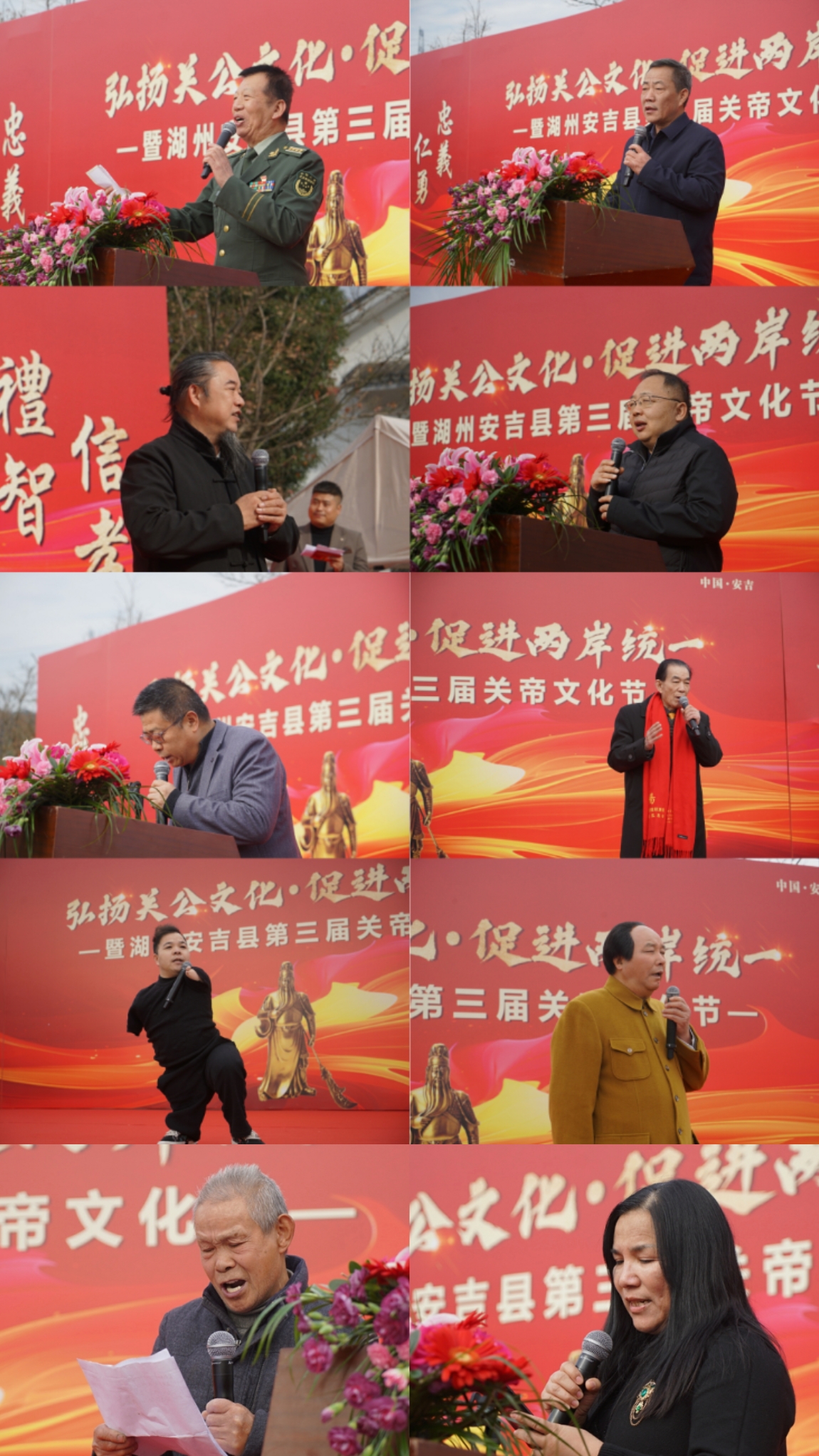 前不久,以“弘扬关公文化·促进两岸统一”为核心主题的安吉关帝文化节,在浙江湖州安吉关帝庙隆重举行。世界关公文化联合发展总会李存有会长致词,关公文化总会执行会长/央媒时代产业创新发展促进中心主任杜平、浙江关公会执行会长孙静、原武警126师政委赵燕清、原南京政治学院领导陈占江、伦敦残奥会演讲嘉宾/中国残联形象大使罗文苟等领导嘉宾做了重要讲话,来自全国各地关公会的领导和各界嘉宾三百多人齐聚一堂,共赴这场传承中华优秀传统文化的盛会。