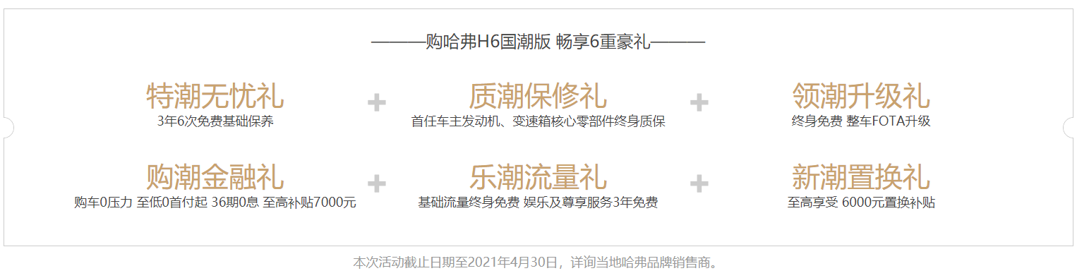 同时,哈弗H6国潮版还用丰厚的新车礼遇,帮助国民实现超值、越级购车梦。现在购哈弗H6国潮版,消费者可享六重豪礼,包括,3年6次免费基础保养的特潮无忧礼,首任车主发动机变速箱核心零部件终身质保的质潮保修礼,终身免费整车FOTA升级的领潮升级礼,至高补贴7000元的购潮金融礼,基础流量终身免费,娱乐及尊享服务3年免费的乐潮流量礼,以及至高6000元的新潮置换礼。正如行业媒体评价,“了解并充分满足用户需求,给用户实实在在的诚意,哈弗H6国潮版不火都难”。